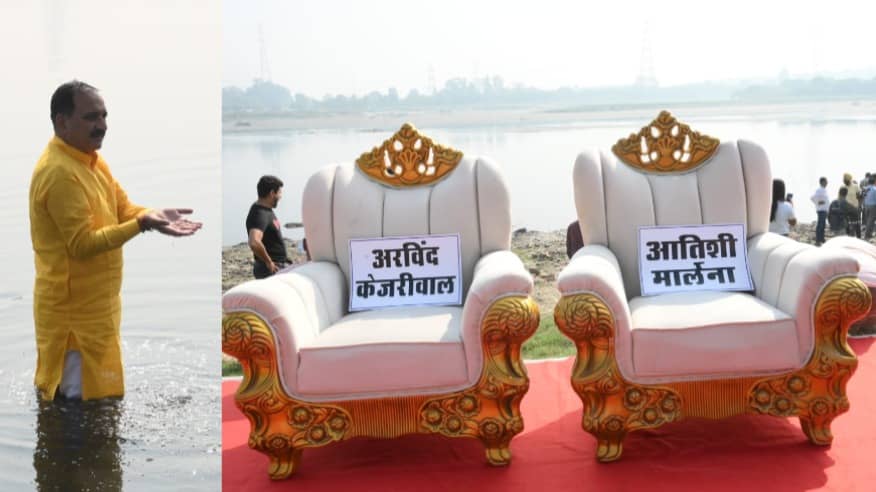 यमुना के घाट पर लगी आतिशी और केजरीवाल की कुर्सी, सामने नदी में नहा रहे BJP के नेता... माजरा क्या है?