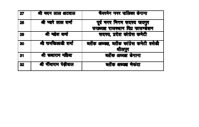 इनमें गहलोत के करीबी और पूर्व कृषि मंत्री लालचंद कटारिया, पूर्व गृह राज्य मंत्री राजेंद्र यादव भी शामिल हैं वही जिन्होंने आलाकमान के खिलाफ लोहा लिया था। वहीं नागौर के कद्दावर जाट नेता और पूर्व विधायक रिछपाल मिर्धा, विजयपाल मिर्धा भी शामिल हैं। पायलट के करीबी माने जाने वाले पूर्व मंत्री खिलाड़ीलाल बैरवा भी इस लिस्ट का हिस्सा हैं।