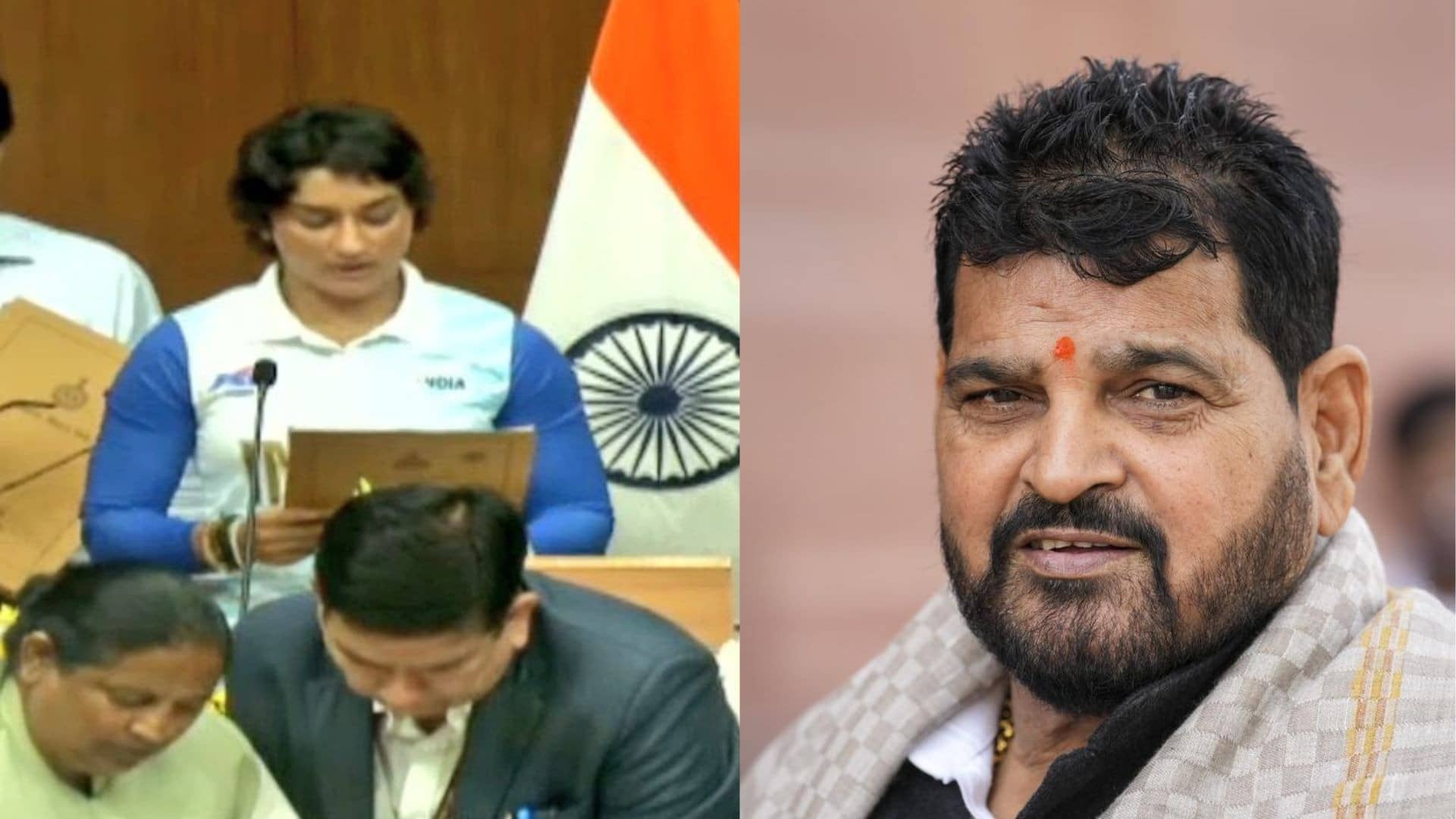 विनेश (Vinesh) ने खिलाड़ियों और किसानों के लिए जहां आवाज बुलंद की तो वहीं इशारों-इशारों में भारतीय कुश्ती महासंघ (WFI) के पूर्व अध्यक्ष बृजभूषण शरण सिंह (Brijbhushan Sharan Singh) पर निशाना साधा। विनेश (Vinesh) ने सोशल मीडिया पर अपने शपथ ग्रहण का एक फोटो शेयर करते हुए लिखा-