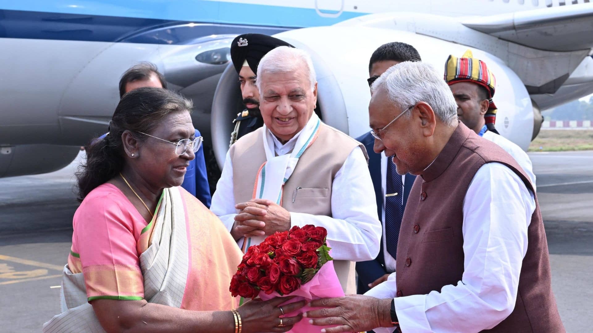 बिहार के राज्यपाल आरिफ मोहम्मद खान और मुख्यमंत्री नीतीश कुमार ने हवाई अड्डे पर राष्ट्रपति का स्वागत किया।