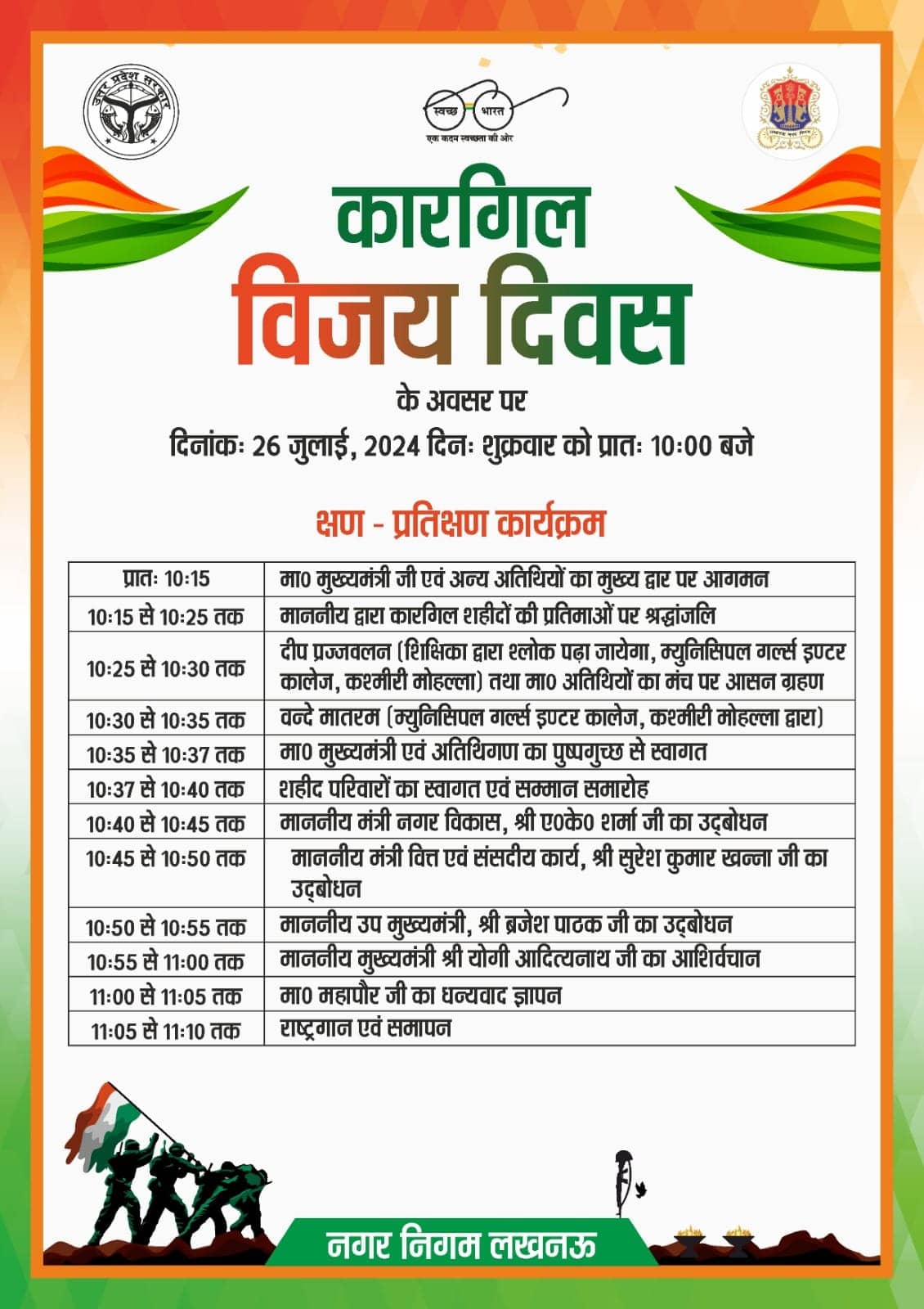 कारगिल विजय दिवस के अवसर पर शुक्रवार (26 जुलाई) को उत्तर प्रदेश के मुख्यमंत्री योगी आदित्यनाथ लखनऊ में कारगिल शहीद स्मृति वाटिका पहुंचकर बलिदानियों को श्रद्धांजलि अर्पित करेंगे। इस दौरान वह भी एक कार्यक्रम में शामिल होंगे और इसे संबोधित करते भी नजर आएंगे।