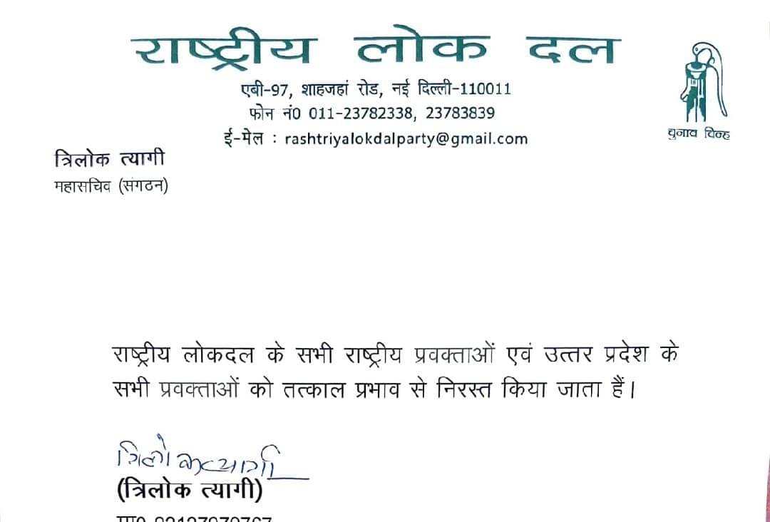 इसके बाद अब RLD ने अपने सभी प्रवक्ताओं को अपने पद से हटा दिया है। इस संबंध में RLD के राष्ट्रीय महासचिव त्रिलोक त्यागी ने एक बयान जारी कर कहा, “राष्ट्रीय लोकदल के सभी राष्ट्रीय प्रवक्ताओं एवं उत्तर प्रदेश के सभी प्रवक्ताओं को तत्काल प्रभाव से निरस्त किया जाता है।”