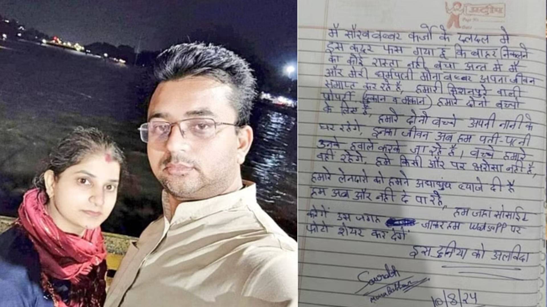 सुसाइड नोट में सौरभ और मोना ने लिखा है कि वह कर्ज के दलदल में इस कदर फंस गए हैं कि बाहर निकलने का कोई रास्ता नहीं है, इसलिए अपनी जान दे रहे हैं। उन्होंने अपने बच्चे की जिम्मेदारी नाना-नानी को सौंपी। सुसाइड नोट में लिखा, "बच्चे अपने नाना-नानी के पास ही रहेंगे। हमें और किसी पर भरोसा नहीं।" सुसाइड नोट के अंत में उन्होंने लिखा, "इस दुनिया को अलविदा।"