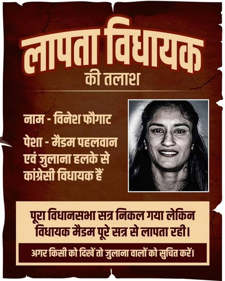 इस पोस्ट में लिखा है, ''लापता विधायक की तलाश, नाम- विनेश फोगाट, पेशा-मैडम पहलवान एवं जुलाना हलके से कांग्रेसी विधायक हैं। पूरा विधानसभा सत्र निकल गया लेकिन मैडम विधायक पूरे सत्र से लापता रहीं। अगर किसी को दिखे तो जुलाना वालों को सूचित करें।''