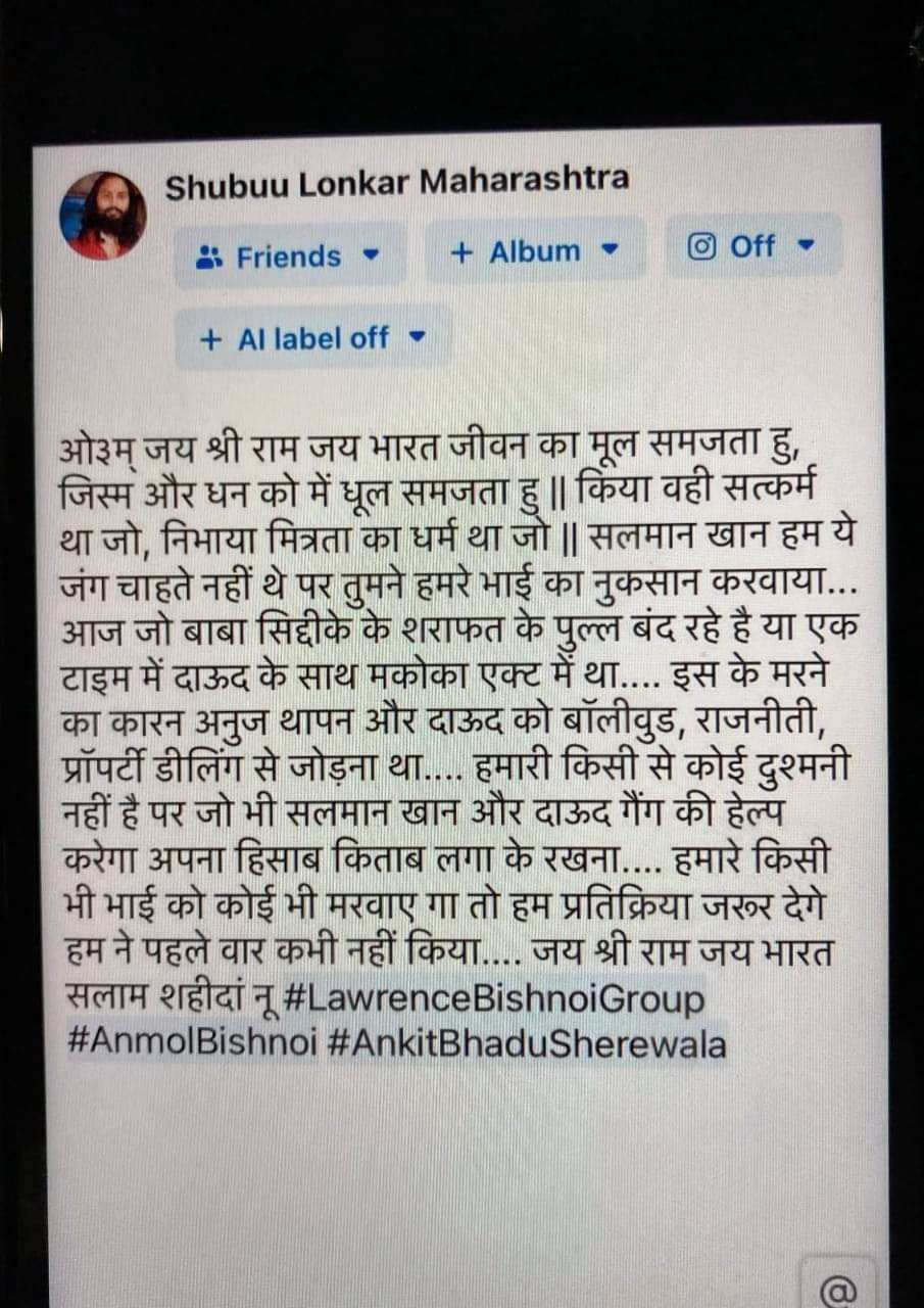रविवार को सोशल मीडिया प्लेटफॉर्म फेसबुक पर शुभु लोनकर महाराष्ट्र नामक यूजर ने बाबा सिद्दीकी की हत्या पर बड़ा कबूलनामा किया। उसने पोस्ट में लिखा, '' बाबा सिद्दीकी के मारने का कारण अनुज थापन और दाऊद को बॉलीवुड, राजनीती, प्रॉपर्टी डीलिंग से जोड़ना था.... हमारी किसी से कोई दुश्मनी नहीं है पर जो भी सलमान खान और दाऊद गैंग की हेल्प करेगा अपना हिसाब किताब लगा के रखना। हमारे किसी भी भाई को कोई भी मारेगा तो हम प्रतिक्रिया जरूर देंगे। हमने पहले वार कभी नहीं किया।''