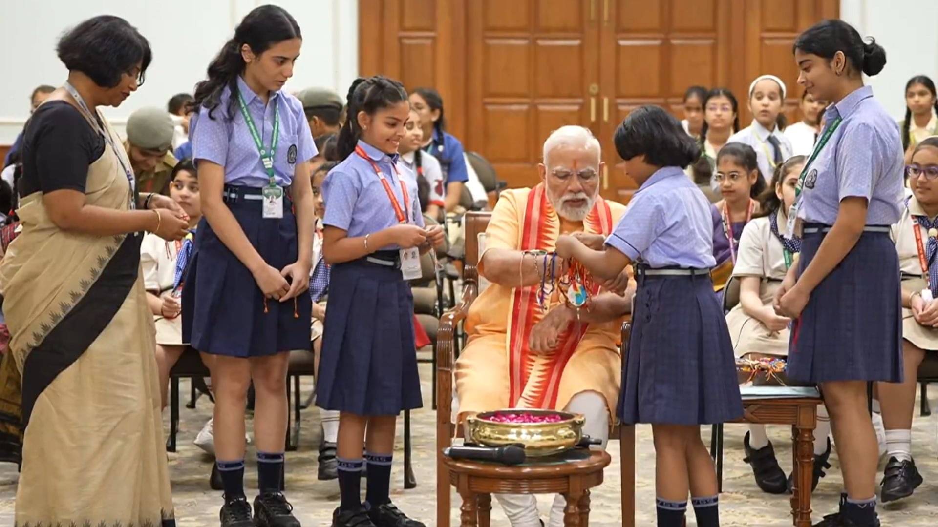 विभिन्न स्कूलों से आई छात्राओं ने प्रधानमंत्री की कलाई पर राखी बांधी और उनके लिए दुआएं भी मांगी। इस दौरान प्रधानमंत्री ने भी उन बच्चियों का दिल से स्वागत किया। वीडियो में पीएम मोदी को बच्चों के साथ खेलते हुए देखा जा सकता है।