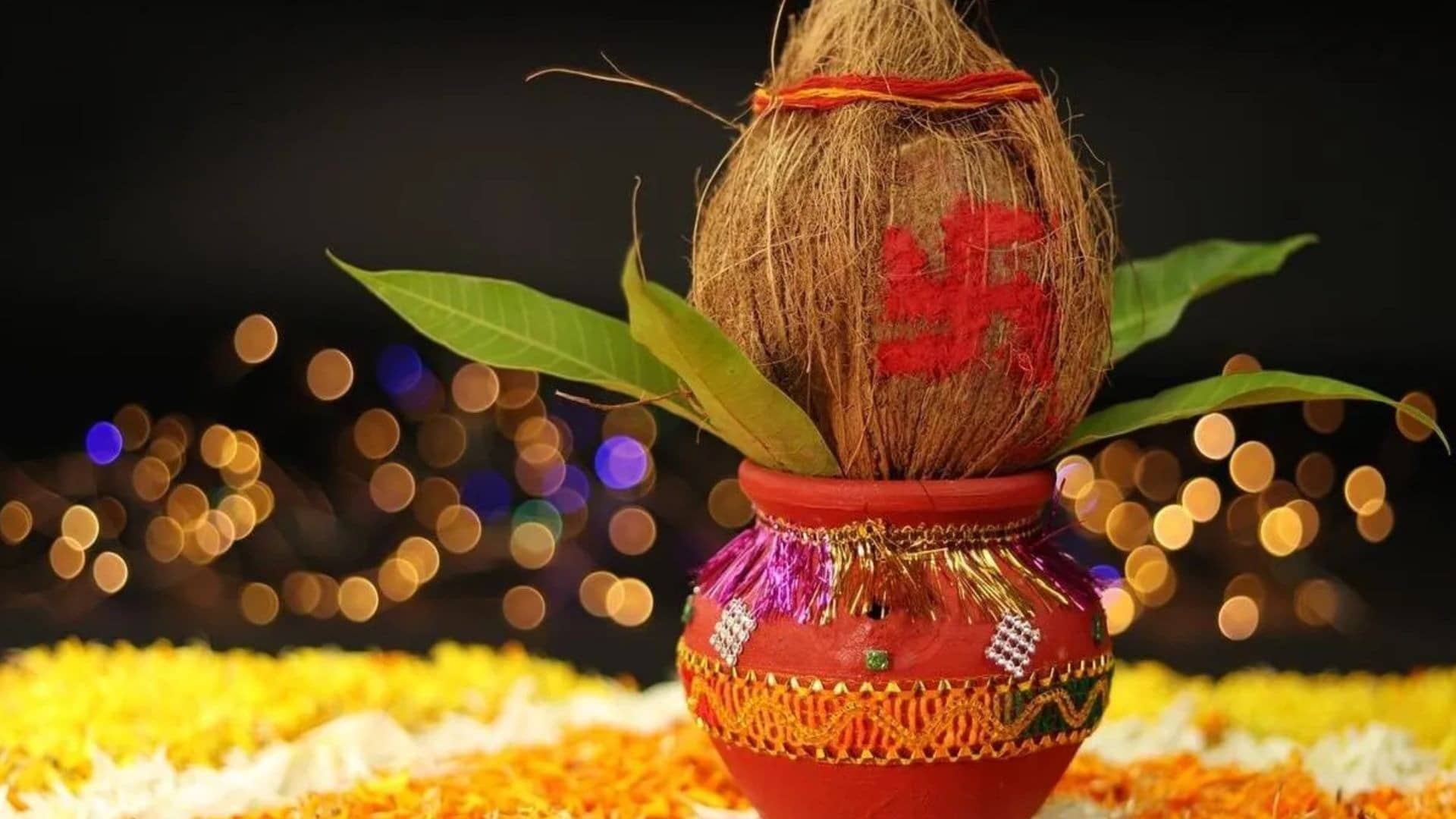 - इसके बाद कलश में 5 आम के पत्ते रखकर उसे ढक दें और ऊपर से नारियल रख दें।