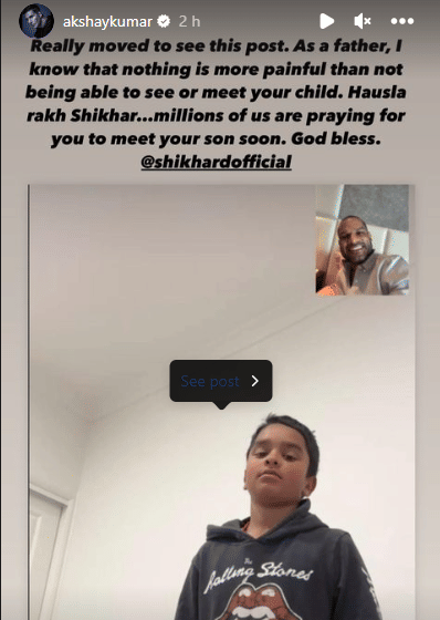 अब शिखर धवन के पोस्ट पर बॉलीवुड अभिनेता अक्षय कुमार ने रिएक्शन दिया है। उन्होंने लिखा, ''वास्तव में इस पोस्ट को देखकर द्रवित हो गया। एक पिता के रूप में, मैं जानता हूं कि अपने बच्चे को न देख पाने या न मिल पाने से ज्यादा दर्दनाक कुछ भी नहीं है। हौसला रख शिखर...हममें से लाखों लोग प्रार्थना कर रहे हैं कि आप जल्द ही अपने बेटे से मिलें। भगवान भला करे।''