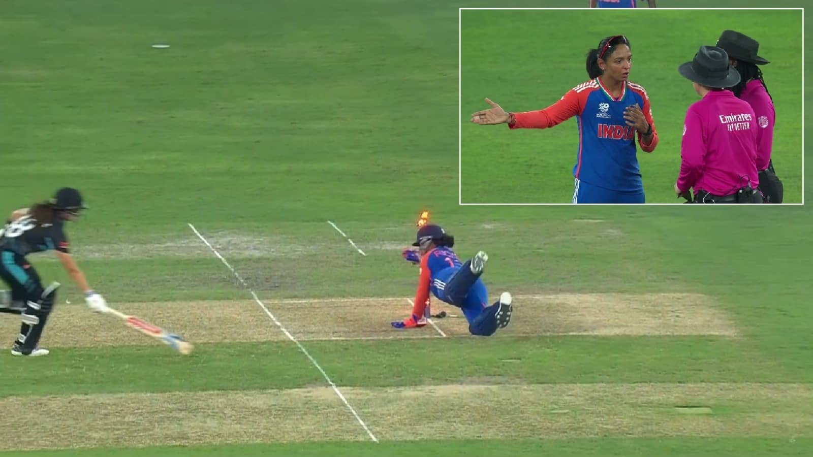 14वें ओवर की आखिरी गेंद पर न्यूजीलैंड की बल्लेबाज ने लॉन्ग ऑफ की दिशा में शॉट खेला। वहां कप्तान हरमनप्रीत कौर फील्डिंग कर रही थीं। उन्होंने आराम से गेंद पकड़ा और फिर उसे हाथ में रखकर ही भागने लगी। कीवी बल्लेबाजों ने चालाकी दिखाते हुए दूसरा रन भागने की कोशिश की। हरमनप्रीत भी तेज निकलीं और उन्होंने शानदार थ्रो फेंका और भारतीय विकेट कीपर ऋचा घोष ने गेंद को स्टंप में दे मारा। बल्लेबाज क्रीज से करीब 2 फीट दूर थीं और ऐसा लगा कि वो आसानी से रनआउट हो गई हैं।
