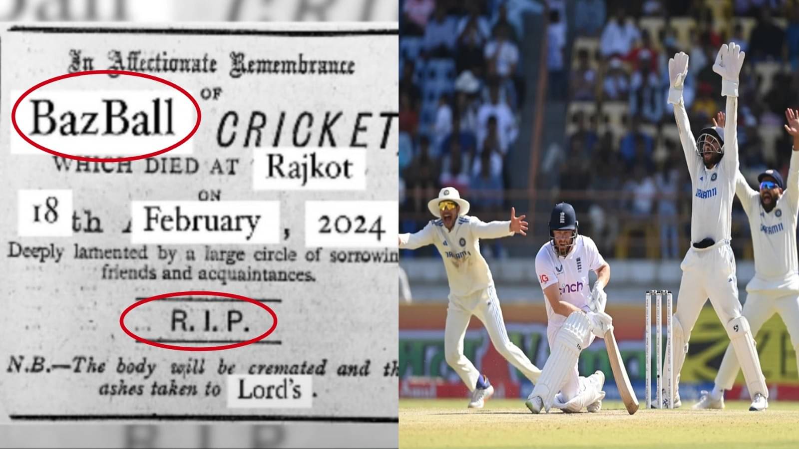 सोशल मीडिया पर बैजबॉल क्रिकेट को लेकर इंग्लैंड टीम पर जमकर तंज कसे जा रहे हैं। एक फोटो तो ऐसा सामने आया है, जिसमें बैजबॉल को मृत यानि डेड बताया गया है।