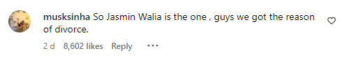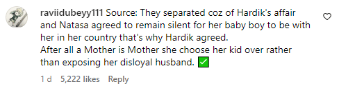 ग्रीस में छुट्टी मना रहे हार्दिक पांड्या के वीडियो पर कमेंट करते हुए एक फैन ने लिखा, 'दोस्तों तो जैस्मिन वालिया हैं हार्दिक और नताशा के बीच तलाक की असली वजह। एक यूजर ने हार्दिक पर गुस्सा करते हुए लिखा, ''नताशा को इतनी गालियां दी, अब इसको गालियां क्यों नहीं दे रहे हो। एक यूजर ने लिखा कि मुझे लगता है हार्दिक ने नताशा को धोखा दिया है। वहीं एक फैन ने तो बड़ी बात बोल दी। उसने लिखा- ''हार्दिक के अफेयर के कारण वे अलग हो गए और नतासा अपने बच्चे के साथ अपने देश में रहने के लिए चुप रहने को तैयार हो गई, इसीलिए हार्दिक सहमत हुए। आखिर मां तो मां होती है, वह अपने बेवफा पति को बेनकाब करने के बजाय अपने बच्चे को चुनती है।
