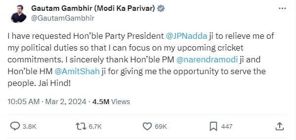 लोकसभा चुनाव 2024 के लिए बीजेपी उम्मीदवारों की पहली लिस्ट जारी होने से पहले गौतम गंभीर ने राजनीति से दूरी बनाने का फैसला किया। उन्होंने सोशल मीडिया के जरिए बीजेपी का आभार जताते हुए कहा कि फिलहाल वो क्रिकेट पर फोकस करना चाहते हैं और इसलिए राजनीति से संन्यास लेना चाहते हैं।