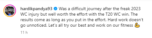 हार्दिक पांड्या ने अपने इंस्टाग्राम पर दो तस्वीरें शेयर की। एक में वो अनफिट नजर आ रहे हैं वहीं दूसरे में सुपर फिट। तस्वीर शेयर करते हुए हार्दिक ने लिखा, ''2023 विश्व कप में चोट लगने के बाद यह यात्रा कठिन थी लेकिन टी20 विश्व कप में जीत के साथ यह प्रयास सार्थक रहा। जब तक आप प्रयास करते हैं परिणाम आते हैं। कड़ी मेहनत पर किसी का ध्यान नहीं जाता. आइए हम सब अपना सर्वश्रेष्ठ प्रयास करें और अपनी फिटनेस पर काम करें।''