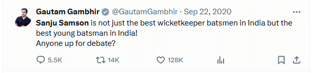 गौतम गंभीर का 4 साल पुराना एक ट्वीट काफी वायरल हो रहा है, जिसमें वह संजू सैमसन के सपोर्ट में उतरे थे और उन्हें भारत का सबसे सर्वश्रेष्ठ युवा विकेटकीपर बल्लेबाज बताया था। गौतम गंभीर ने सितंबर 2020 में संजू सैमसन के सपोर्ट में एक ट्वीट किया था और डिबेड करने के लिए चैलेंज दिया था। उन्होंने ट्वीट में लिखा था, ''संजू सैमसन भारत में सिर्फ बेस्ट विकेटकीपर बल्लेबाज नहीं है बल्कि वह भारत में सर्वश्रेष्ठ युवा बल्लेबाज हैं। कोई डिबेट करना चाहेगा?''