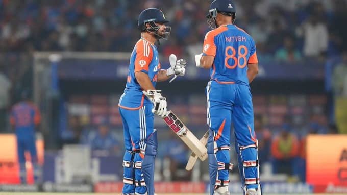 नीतीश और रिंकू ने आक्रामक अंदाज में बल्लेबाजी की और दोनों के बीच चौथे विकेट के लिए 108 रनों की साझेदारी हुई। इस दौरान अपना दूसरा टी20 अंतरराष्ट्रीय मुकाबला खेल रहे नीतीश ने करियर का पहला अर्धशतक जड़ा। पचासा लगाने के बाद भी नीतीश ने आक्रामक बल्लेबाजी नहीं रोकी और लगातार शॉट खेलते रहे। नीतीश हालांकि, 34 गेंदों पर चार चौकों और सात छक्कों की मदद से 74 रन बनाकर आउट हुए। नीतीश के आउट होने के बाद रिंकू सिंह ने भी अर्धशतक जड़ा, लेकिन वह 29 गेंदों पर पांच चौकों और तीन छक्कों की मदद से 53 रन बनाकर पवेलियन लौटे।