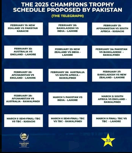 ब्रिटेन के एक अखबार 'द टेलग्राफ' ने इस शेड्यूल को छाप दिया है जिसके अनुसार चैंपियंस ट्रॉफी 2025 का आगाज 19 फरवरी को होगा। ओपनिंग मुकाबले में मेजबान पाकिस्तान का सामना न्यूजीलैंड से होगा। ये मैच कराची में खेला जाएगा।
