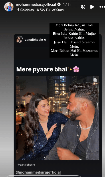 मोहम्मद सिराज ने जनाई भोसले के इस खूबसूरत पोस्ट का और खूबसूरत तरीके से जवाब दिया। हैदराबाद के तेज गेंदबाज ने बॉलीवुड अंदाज में लिखा, ''मेरे बहना की जैसी कोई बहना नहीं, बिना इसके कहीं भी मुझे रहना नहीं, जैसे हैं चांद सितारों में, मेरी बहना है एक हजारों में।''
