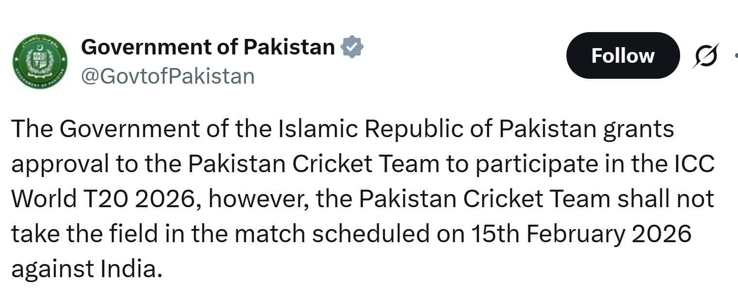 पाकिस्तानी सरकार के आधिकारिक एक्स हैंडल से किए गए पोस्ट में लिखा है, 'पाकिस्तान की सरकार ने पाकिस्तान क्रिकेट टीम को टी20 वर्ल्ड कप-2026 में हिस्सा लेने की अनुमति दे दी है। हालांकि, पाकिस्तान क्रिकेट टीम 15 फरवरी को भारत के खिलाफ होने वाले मैच में मैदान पर नहीं उतरेगी।'