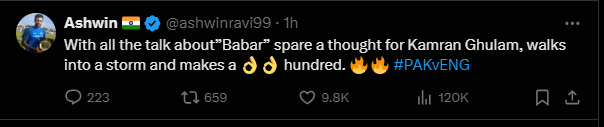 अश्विन ने अपने X अकाउंट पर लिखा कि बाबर आजम की चर्चा हो रही थी, इस बीच कामरान गुलाम के बारे में विचार करें जो तूफान के बीच आए और शानदार शतक जड़ दिया। अश्विन के इस पोस्ट को बाबर के जख्म पर नमक रगड़ने जैसा देखा जा रहा है और फैंस खूब मजे ले रहे हैं।