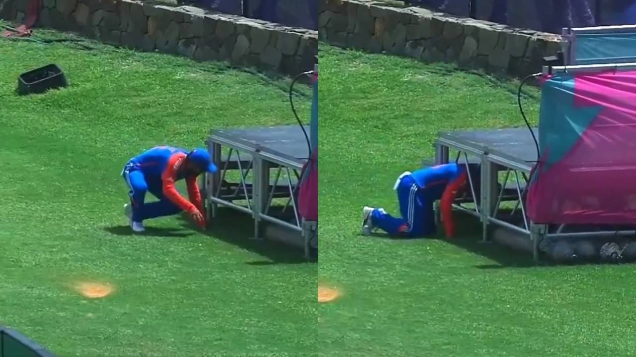 बांग्लादेश की बैटिंग पारी के दौरान के मजेदार दृश्य देखने को मिला। 17वें ओवर के दौरान रिशद हुसैन ने अर्शदीप सिंह की गेंद पर शानदार छक्का जड़ा। बॉल मैदान के बाहर एक मंच के नीचे घुस गई। फिर विराट कोहली ने दिखाया अपना चुलबुला अंदाज। उन्होंने अपनी बॉडी को स्प्रिंग की तरह छोटा किया और मंच के नीचे गेंद ढूंढने चले। ऐसा लगा मानो कोई सांप किसी बिल में घुस रहा हो। उनका ये अंदाज फैंस को बेहद पसंद आ रहा है और ये वीडियो सोशल मीडिया पर धमाल मचा रही है।