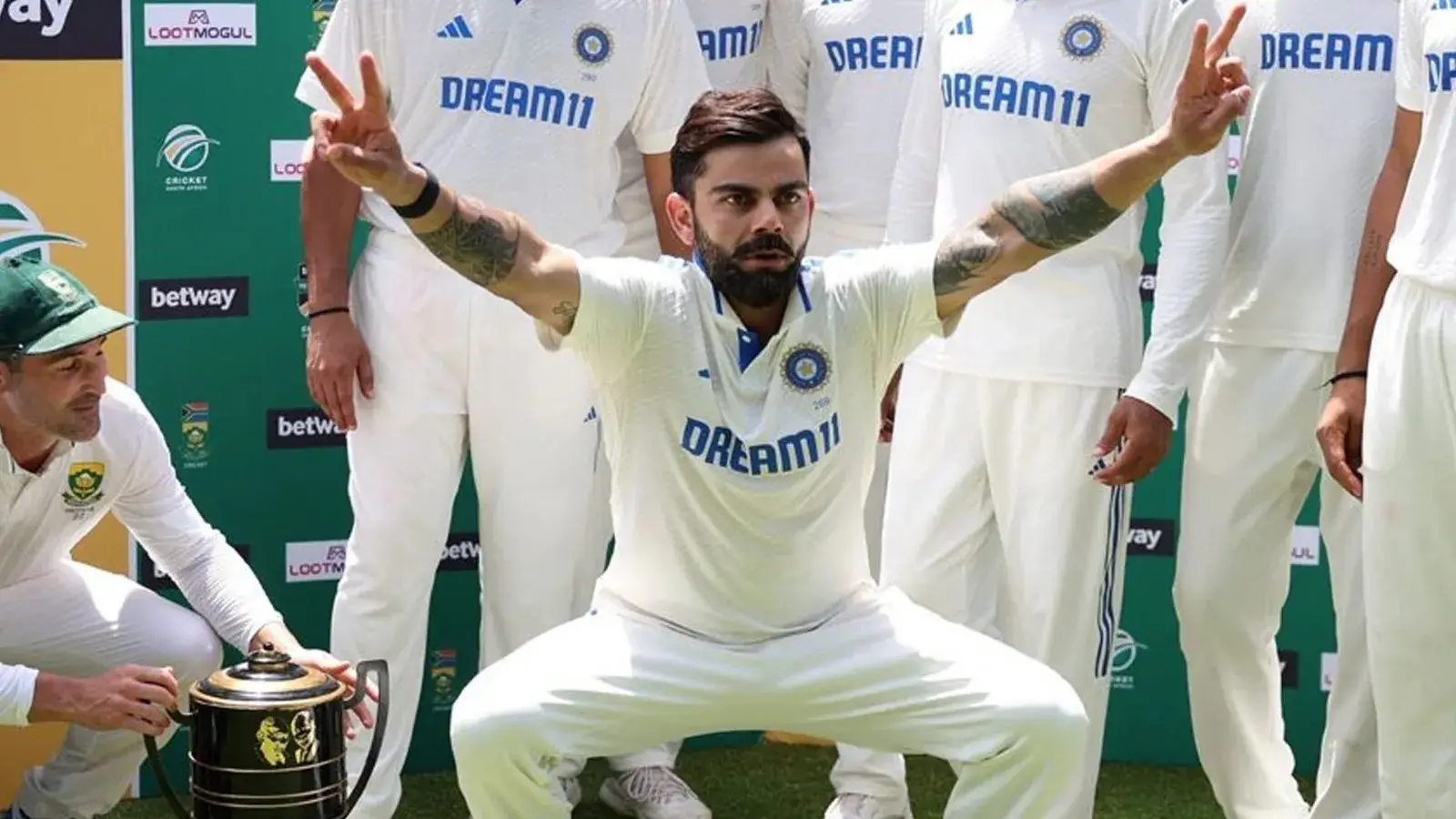 अब विराट कोहली ने साउथ अफ्रीका के खिलाफ मिली ऐतिहासिक जीत के बाद मजेदार अंदाज में जश्न मनाया है। भारत-साउथ अफ्रीका के बीच दो मैचों की टेस्ट सीरीज 1-1 की बराबरी पर खत्म हुई। दोनों टीमों को ट्रॉफी के साथ फोटो खिंचवाने का मौका मिला। जब टीम इंडिया की तस्वीर खींची जा रही थी तब विराट कोहली ने दोनों हाथ ऊपर कर खुशी का इजहार किया और मानो ये कह रहे हों कि 'कैमरा मैन इधर फोकस करो।'