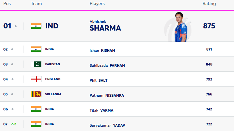 इंटरनेशनल क्रिकेट काउंसिल (ICC) ने बुधवार, 25 मार्च को मेंस क्रिकेट की ताजा रैंकिंग जारी की। ताजा रैंकिंग के अनुसार भारतीय टीम के ओपनर अभिषेक शर्मा शीर्ष पर हैं। अभिषेक शर्मा 875 अंकों के साथ टॉप पर बने हुए हैं। अभिषेक शर्मा पिछले कई महीनों से टॉप पर बने हुए है। वहीं, अभिषेक से नीचे ईशान किशन मौजूद हैं।
