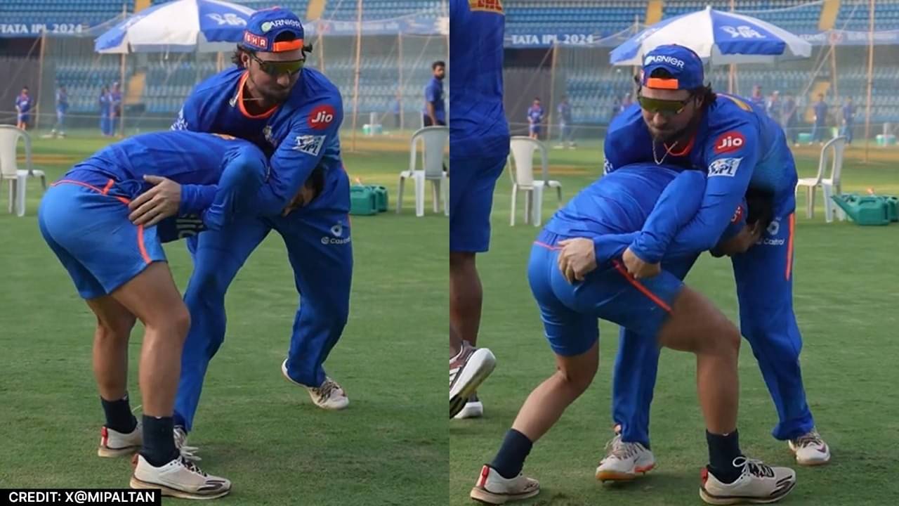 मुंबई इंडियंस (Mumbai Indians) इस वक्त 13 मैचों में 8 अंकों के साथ 10वें स्थान पर है और उसका एक मैच बाकी है, जो कल 17 मई को होगा। मुंबई लखनऊ सुपर जायंट्स (LSG) से भिड़ेगी और इस मुकाबले में मुंबई के पास खोने के लिए कुछ नहीं है। ऐसे में टीम के खिलाफ चिल मोड में हैं। मुंबई इंडियंस (Mumbai Indians) के दो स्टार खिलाड़ियों का एक मजेदार वीडियो सामने आया है, जिसमें दोनों 'धोबी पछाड़' करते नजर आ रहे हैं।