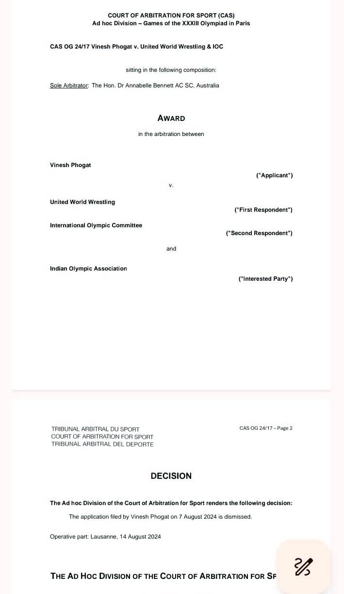 भारतीय ओलंपिक संघ (IOA) की अध्यक्ष पीटी उषा ने भी CAS के फैसले पर निराशा व्यक्त करते हुए कहा कि ये निर्णय ना सिर्फ विनेश बल्कि पूरे खेल जगत के लिए झटका है। अब सवाल ये है कि विनेश फोगाट का ओलंपिक में मेडल जीतने का सपना पूरी तरह से टूट चुका है या अभी भी कुछ रास्ते हैं जिसके जरिए वो सिल्वर मेडल जीत सकती है।