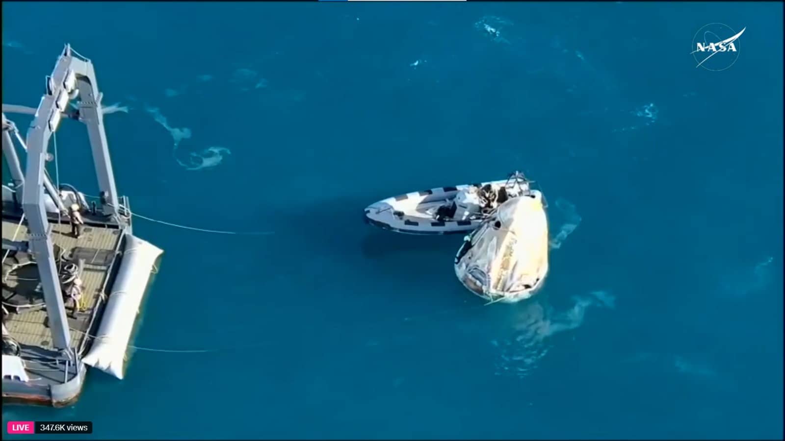 ड्रैगन कैप्सूल को बोट पर रेस्क्यू किया: इसके बाद ड्रैगन कैप्सूल को फास्ट बोट पर रेस्क्यू किया गया। रिकवरी शिप पर रेस्क्यू किए जाने के बाद कैप्सूल को समुद्र से बाहर लाया गया।