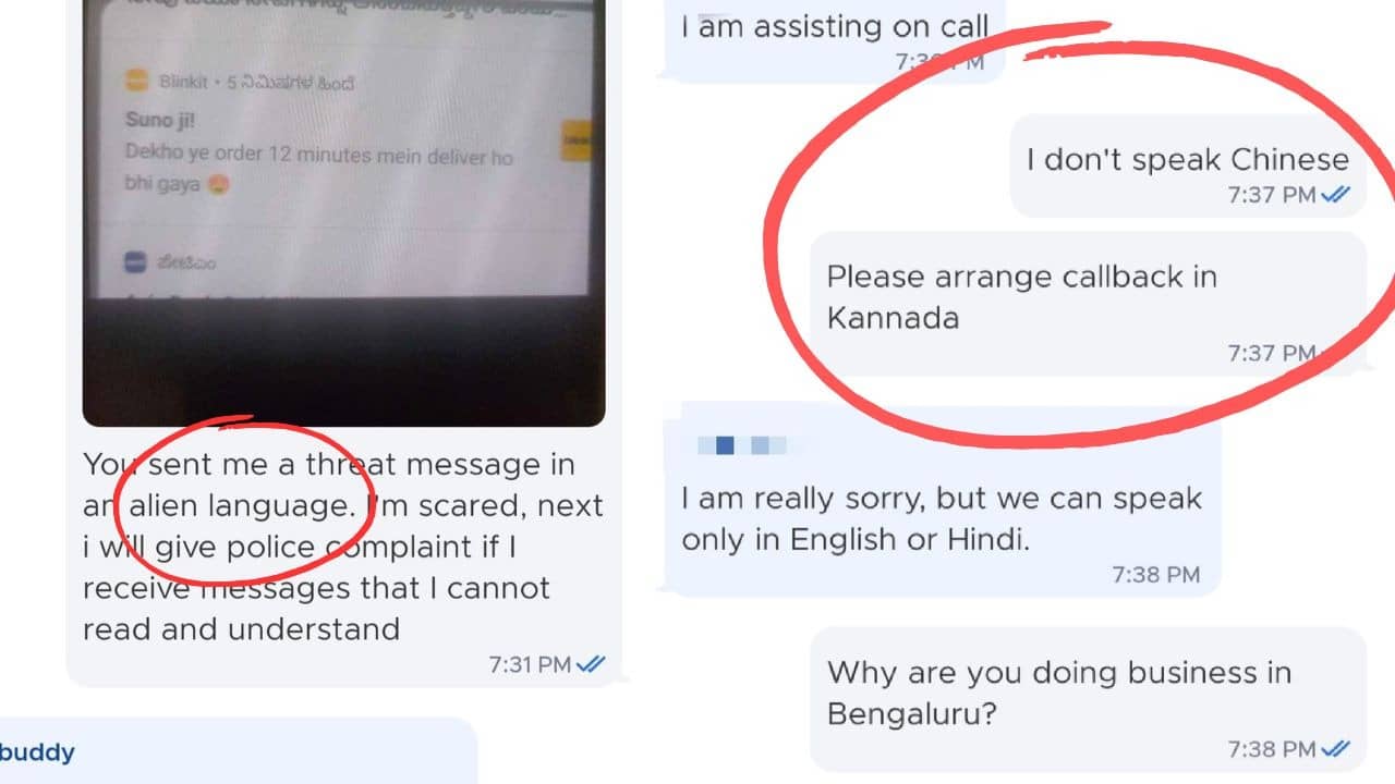 ऑनलाइन ग्रोसरी डिलीवरी ऐप Blinkit ने एक कन्नड़ शख्स को हिंदी में नोटिफिकेशन भेज दिया। जिसके बाद गुस्साए शख्स ने कंपनी पर जमकर अपनी भड़ास निकाली। हिंदी को एलियन लोगों की भाषा बताते हुए उसने पुलिस में शिकायत करने तक की धमकी दे दी। ये शख्स सिर्फ इस बात लेकर इतना आगबबूला कि ब्लिंकिट ने उसे कन्नड़ के बजाय हिंदी में नोटिफिकेशन भेज दिया। इसके बाद शख्स ने इंग्लिश में ब्लिंकिट की सपोर्ट टीम को जमकर लताड़ा और चैट का स्क्रीनशॉट X पर शेयर किया, जो अब सोशल मीडिया पर वायरल हो रहा है।