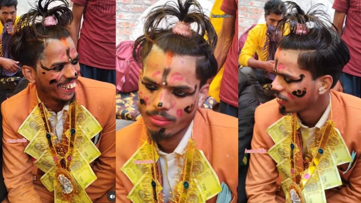 वीडियो में देखा जा सकता है कि बच्चों की तरह दूल्हे के बालों की चोटी बनाई हुई थी। उसके माथे और गाल पर काला टीका लगाया गया है। बिल्कुल वैसा ही जैसा बचपन में मां अपने नन्हे बच्चों को लगाती है। होंठों पर लिपस्टिक और गालों पर कुछ और विचित्र चित्रण किया गया है। लेकिन दूल्हा अच्छे खासे सूट बूट नजर आया। साथ ही गले में नोटों की माला पहनी हुई थी। मांग में ऑरेंज कलर का टीका या फिर सिंदूर सा लगा नजर आ रहा है। हालांकि चेहरा देख ऐसा लग रहा है जैसे जानबूझकर उसे इस तरह का हास्यास्पद लुक दिया गया हो।