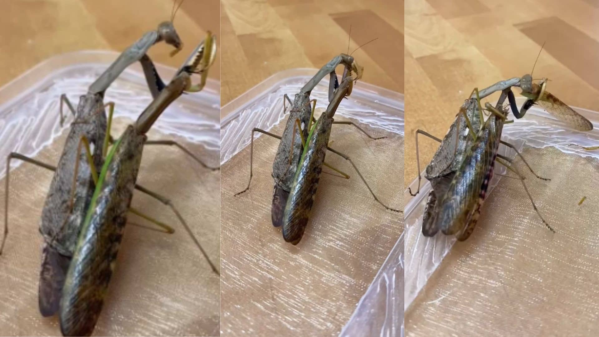 आपको बता दें कि यह वीडियो प्रेइंग मैंटिस नाम के एक कीड़े की है। इसे @sciencegirl जैसे अकाउंट्स ने शेयर किया है। इसका पूरा क्रेडिट कीड़ा प्रेमी @insecthaus_adi को दिया गया है। वीडियो में देखा जा सकता है कि एक मादा प्रेइंग मैंटिस अपने नर साथी के साथ संबंध बनाते के समय ही उसे खाना शुरू कर देती है। दोनों कीड़े मेटिंग कर रहे होते हैं। अचानक मादा नर का सिर या शरीर का हिस्सा काटकर खाने लगती है।