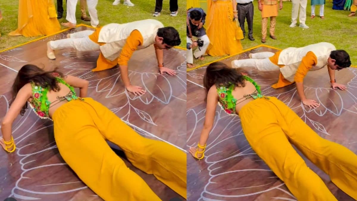 हल्दी फंक्शन में फिटनेस कॉम्पिटिशन का तड़का! दुल्हन ने दूल्हे को ठुमकों से नहीं, पुशअप्स से दी मात; मजेदार वीडियो VIRAL
