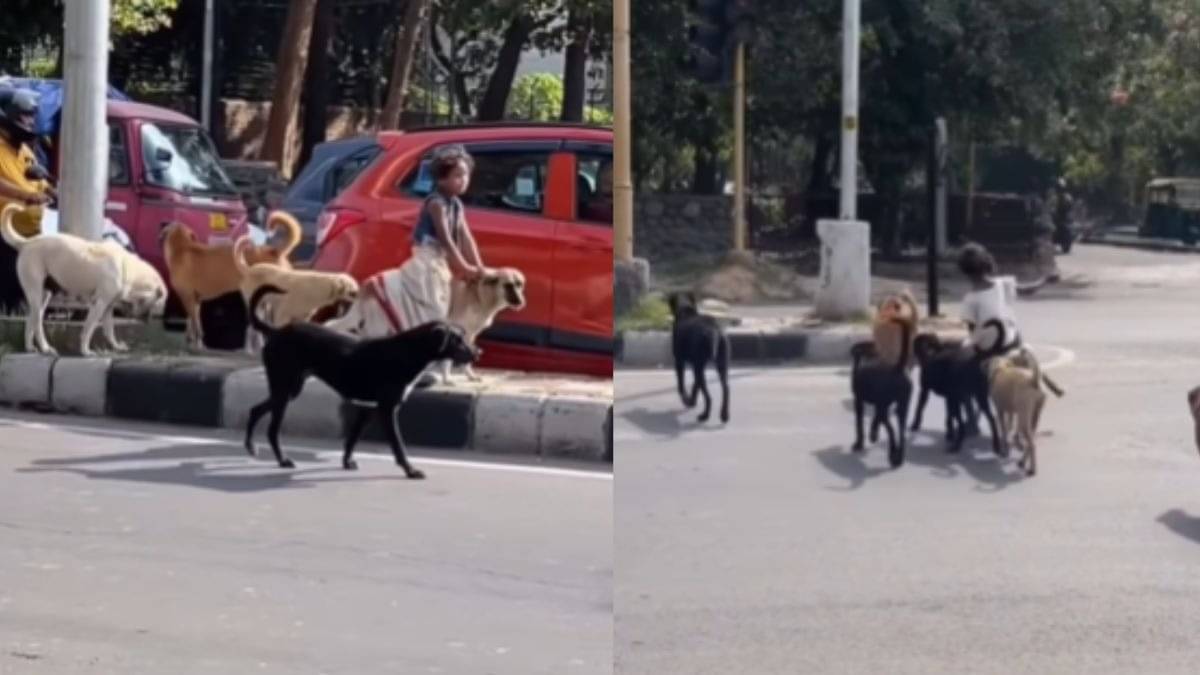 इन दिनों वायरल हो रही क्लिप में देखा जा सकता है कि कैसे कुत्तों से घिरी बच्ची किसी 'राजकुमारी' की तरह सड़क क्रॉस कर रही है।