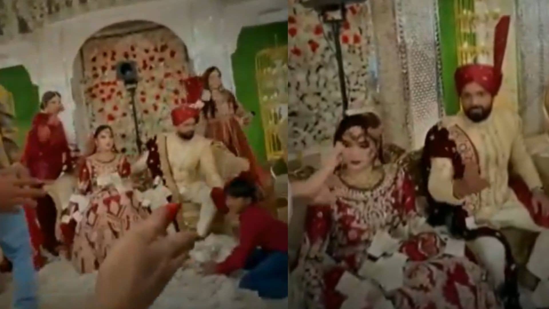 वीडियो में देखा जा सकता है कि दूल्हा-दुल्हन स्टेज पर खड़े होते हैं। इस दौरान माइक थामकर दूल्हा कहता है कि अपने बच्चों को पास बैठाकर रखें और शूट खराब न करें। इसके बाद आगे वीडियो में कपल को स्टेज पर बैठ जाता है और उन पर पैसों की बारिश होने लगती हैं। इसी बीच एक बच्चा वहां आकर घुसने लगता है। तभी दूल्हा गुस्से में आपा खोते हुए उसे एक थप्पड़ मार देता है।