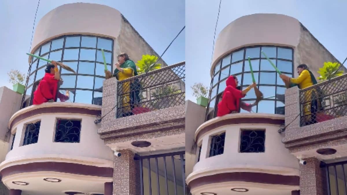 नहीं देखी होगी ऐसी अनोखी लड़ाई... छज्जे से एक-दूसरे पर झाड़ू चलाने लगीं पड़ोसन; VIDEO देख हो जाएंगे लोटपोट