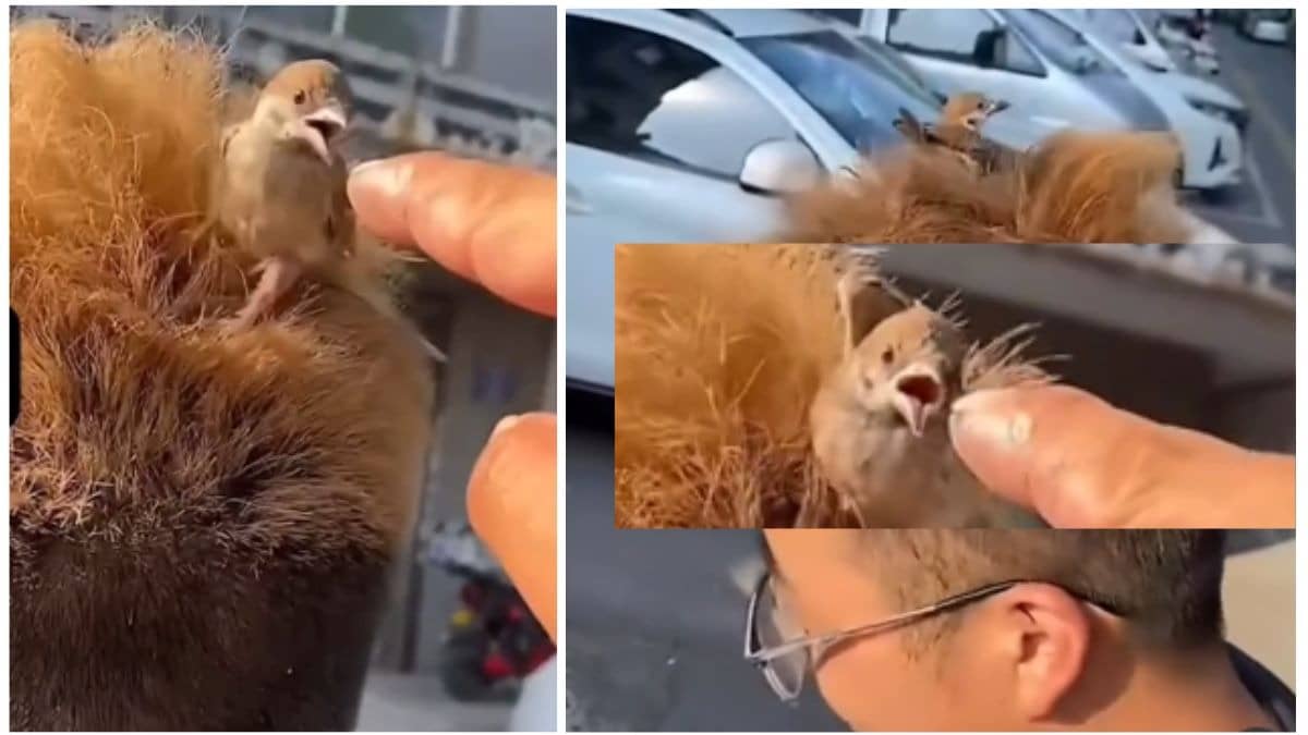 चिड़िया ने आदमी के बालों को अपना घोंसला समझकर मजेदार हरकतें कीं, देखें वायरल वीडियो।