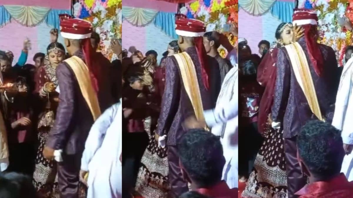 दरअसल, वीडियो एक शादी समारोह का है जहां स्टेज पर दूल्हा और दुल्हन सज-धज पर खड़े हैं। परिवारजन, करीबी रिश्तेदार और मेहमानों का जमावड़ा लगा हुआ है। इस खुशी के मौके पर पहले दूल्हा नोटों की बारिश करता है। इसके बाद दुल्हन भी अपने दूल्हे की नजर उतारते हुए पैसे लुटाती है। इतना ही नहीं, पैसे लुटाने के बाद दुल्हन एक्साइटमेंट में सभी के आगे दूल्हे को चूम लेती है। वहीं दूल्हा भी पीछे नहीं हटता और भी दुल्हनिया को किस कर लेता है। दोनों की इस हरकत के अगले ही पल पूरा माहौल बदल जाता है। हर कोई हैरान भरी निगाहों से देखता रह जाता है।