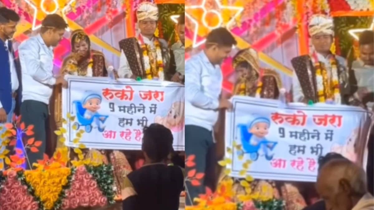 हुआ यूं कि स्टेज पर दोस्तों ने दूल्हा-दुल्हन संग कई फोटोज खिंचवाईं। अब बारी गिफ्ट देने की आई। दूल्हे के दोस्त गिफ्ट में एक पोस्टर लेकर पहुंचे थे। लेकिन ये पोस्टर बनवाया गया था। इस कस्टमाइज पोस्टर में नन्हे से बच्चे की तस्वीर थी और पोस्टर पर लिखा हुआ था, 'रुका जरा... 9 महीने में हम भी आ रहे हैं।' इस पोस्टर को जैसे ही दुल्हन ने देखा वो शर्म से लाल हो गई। इतना ही नहीं, दूल्हा भी दोस्तों का अनोखा गिफ्ट देख भौचक्का रह गया। वहीं शादी में आए मेहमान भी हंस-हंसकर लोटपोट हो गए।