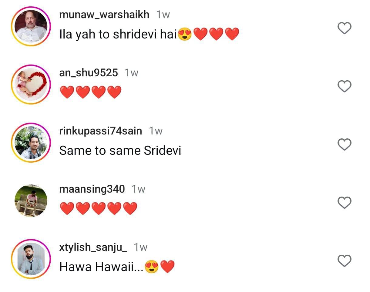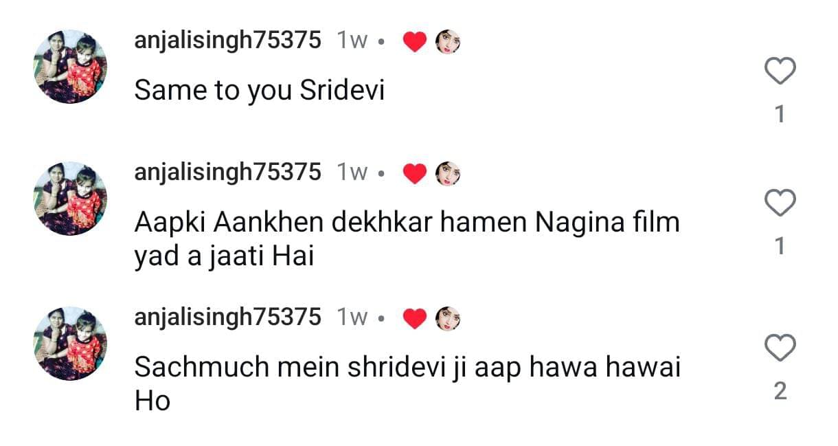 एक यूजर ने लिखा, 'सेम टू सेम श्रीदेवी।' दूसरे यूजर ने लिखा, 'आपकी आंखें देखकर हमें नागिना फिल्म याद आ जाती है।' एक और यूजर ने लिखा, 'सच में श्रीदेवी जी आप हवा हवाई हो।' एक ने लिखा, 'सुपर से ऊपर। छोटी श्रीदेवी दिपाली चौधरी।' एक ने लिखा, 'डुप्लीकेट श्रीदेवी।' एक और यूजर ने लिखा, 'वाह सेम टू सेम श्रीदेवी जी।' एक और यूजर ने लिखा, 'ऐसा लगता है श्रीदेवी जी दुनिया को छोड़कर नहीं गई है, वो दुनिया में ही है।' एक और ने लिखा, 'आपकी शक्ल श्रीदेवी से मिलती है, आप अच्छी लग रही हो।'