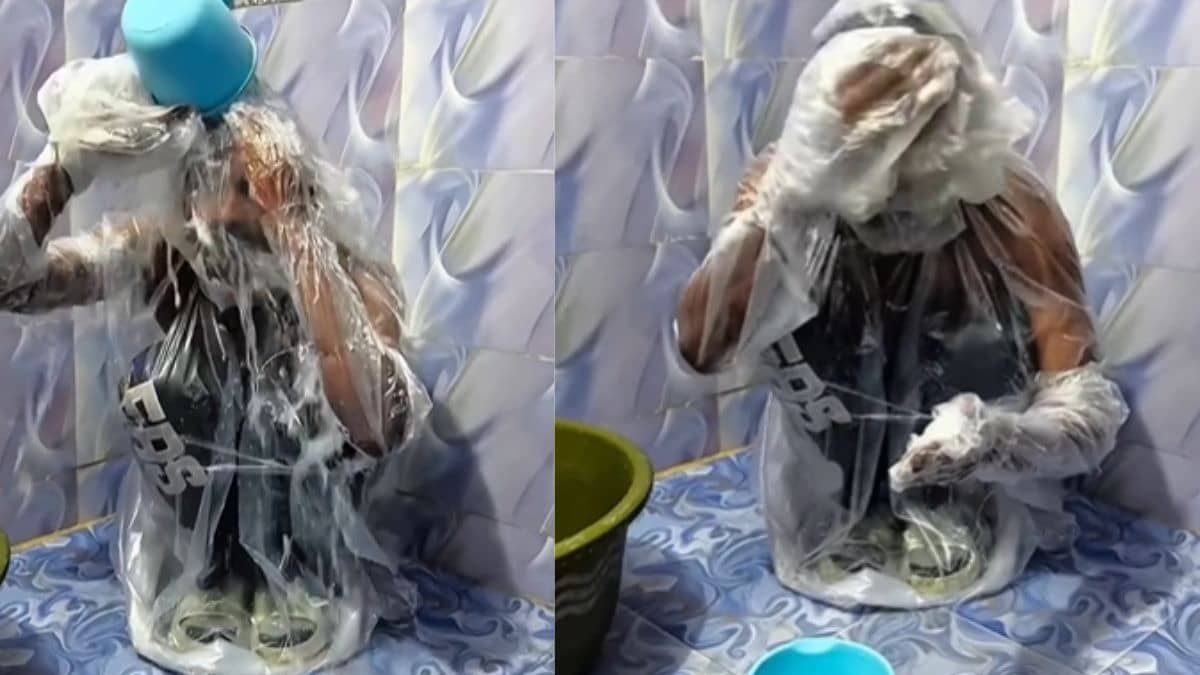 शख्स के प्लास्टिक पहनकर नहाने का अनोखा अंदाज