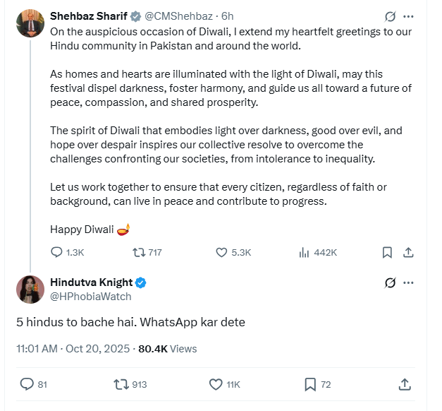 पाक पीएम शहबाज शरीफ ने अपने इस पोस्ट में लिखा - "दिवाली के पावन अवसर पर, मैं पाकिस्तान और दुनिया भर में हमारे हिंदू समुदाय को हार्दिक शुभकामनाएं देता हूं। दिवाली की रोशनी से घर और दिल जगमगा रहे हैं, और यह त्योहार अंधकार को दूर करे, सद्भाव को बढ़ावा दे और हम सभी को शांति, करुणा और साझा समृद्धि के भविष्य की ओर ले जाए।